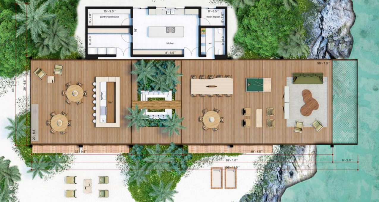 These architectural concepts showcase the vision for our club lounge and restaurant, designed to complement the natural beauty of Victoria Cay while providing an elevated dining experience.